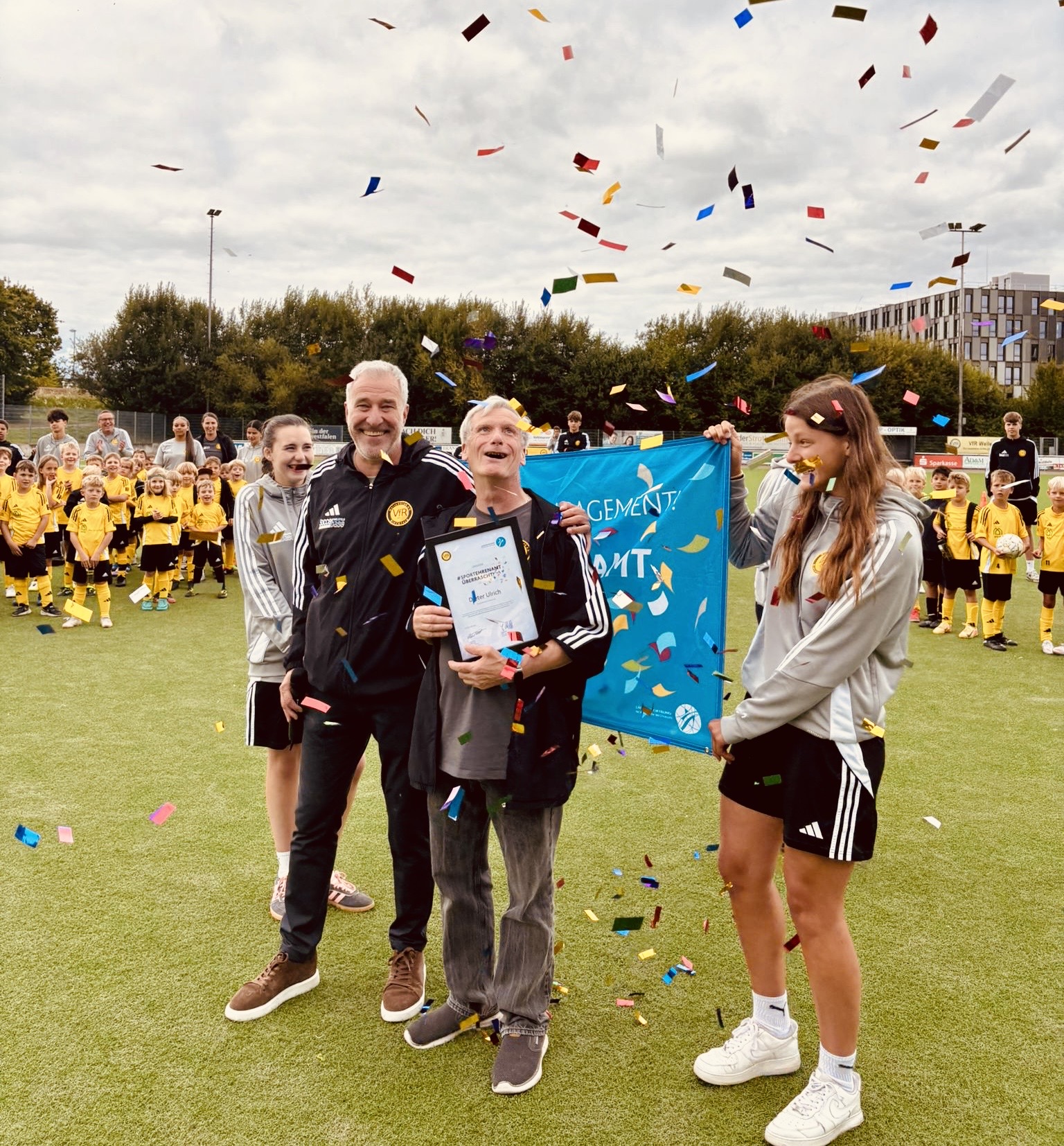 Das diesjährige CampusKicker Feriencamp hielt eine ganz besondere Überraschung bereit. Vor rund 150 Camp-Kindern und etwa 300 Zuschauer:innen wurde Dieter Ulrich im Rahmen der Aktion „Sportehrenamt überrascht“ des Landessportbunds Nordrhein-Westfalen (LSB NRW) geehrt.