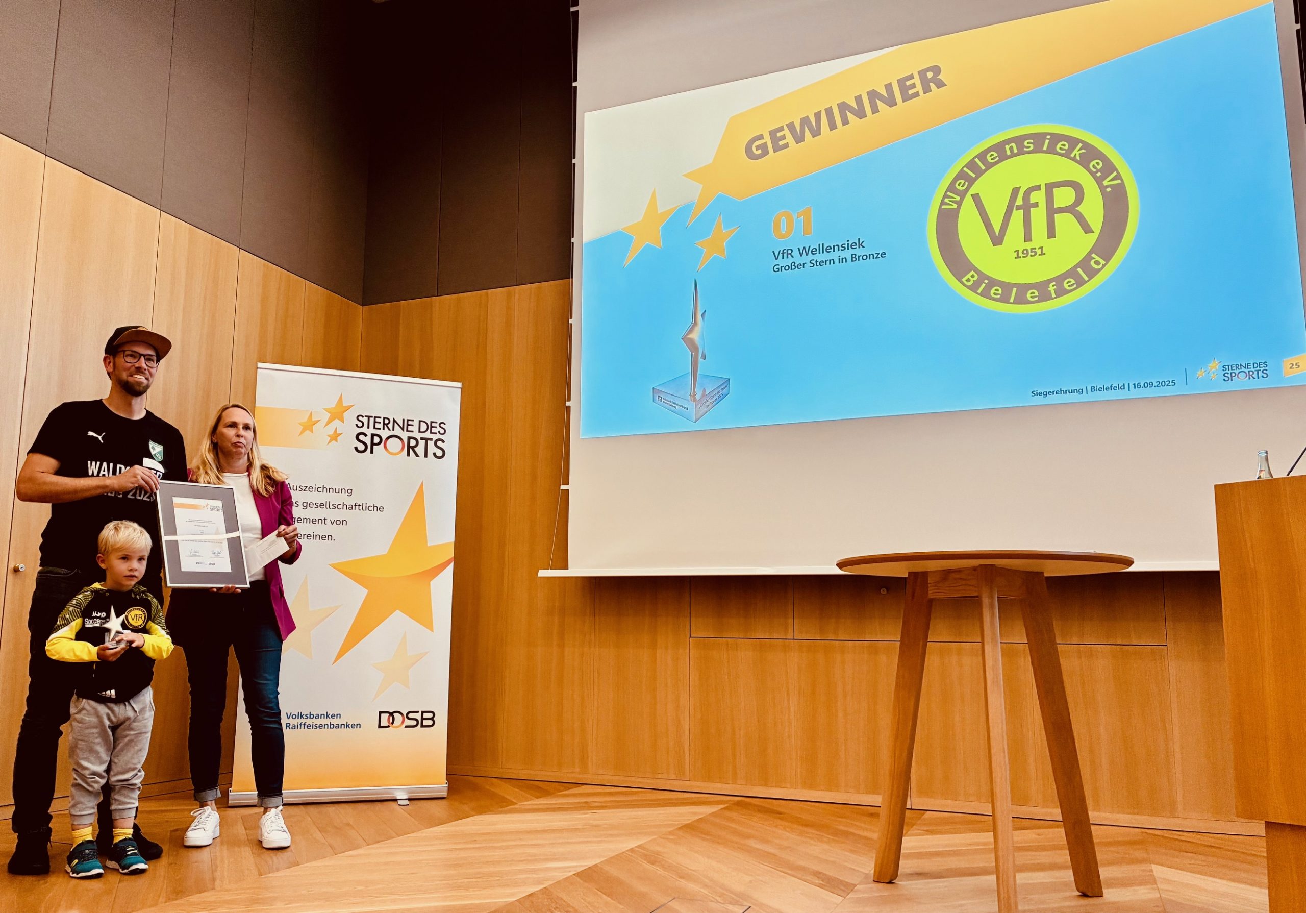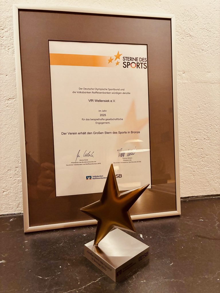 Der VfR Wellensiek hat gestern eine herausragende Auszeichnung erhalten: Die U8 Waldkicker wurden mit dem Großen Stern des Sports in Bronze geehrt. Dieser Preis, verliehen vom Deutschen Olympischen Sportbund (DOSB) und den Volksbanken Raiffeisenbanken, ist Deutschlands bedeutendste Auszeichnung für das gesellschaftliche Engagement von Sportvereinen und würdigt einmal mehr die herausragende Saison 2024/25 unserer jüngsten Talente.